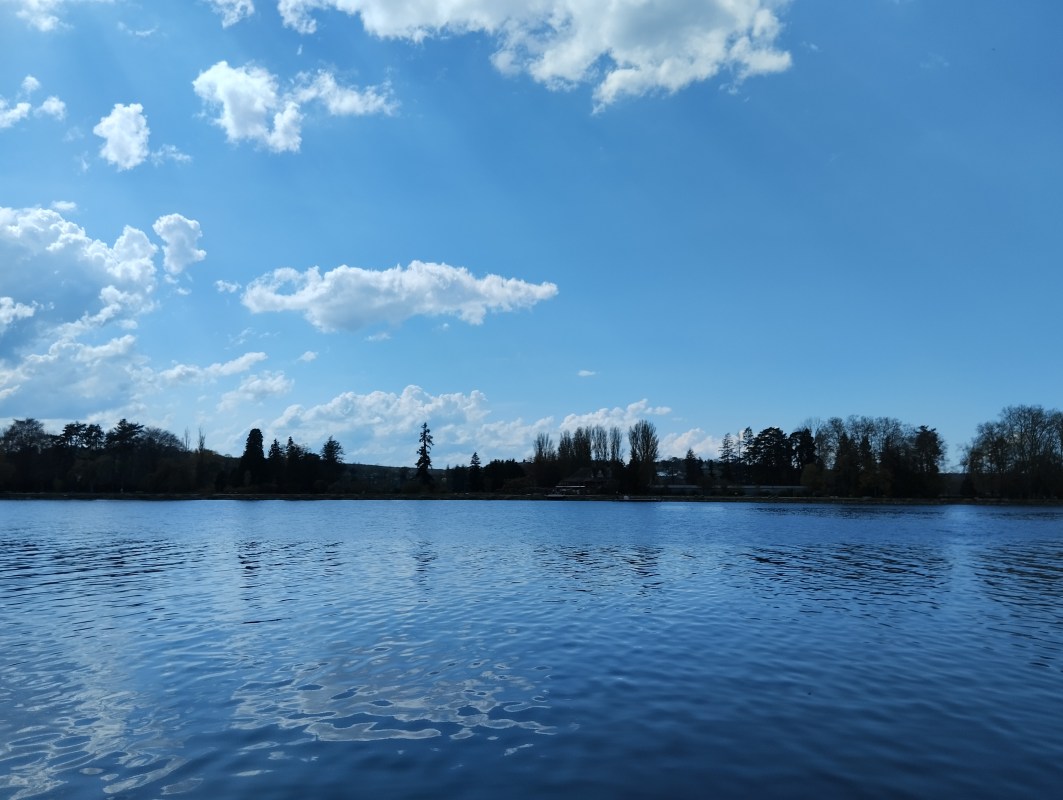 Pas une ride n’agitait l’eau semblable à un grand miroir renvoyant au ciel toute sa couleur bleue  et jusqu’au nuage là haut, parfaitement reflété en bas. Le peintre de l’univers était à son affaire dans cet immense lavis ton sur ton.